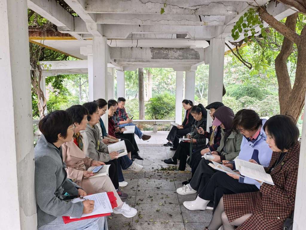 “共读一本好书,共提生命品质”,是宝荷书苑的宗旨,他们读写结合,学以致用。宝荷书苑一行十几人把诗歌训练营课堂搬到泉城公园牡丹亭内,大家一起学习了黄梵的《意象的帝国》。会长孙秀君对“结尾写作法”“作品的多重真实与主题”这两节课的主要内容进行了总结和归纳,使大家对学习的内容更加明晰。活动中,文友们分享了各自的作品,大家对分享的作品展开了热烈的讨论,使作品在探讨和碰撞中变得更加完美。